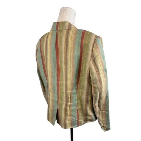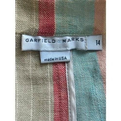 Command attention in this Garfield & Marks blazer, a vibrant statement piece that blends professional polish with relaxed sophistication. The eye-catching vertical stripes in shades of sage, coral, yellow, and beige create a visually stunning effect, while the classic blazer silhouette ensures a flattering fit. The single-button closure adds a touch of refinement, complemented by the subtle welt pockets. Crafted from breathable linen, this blazer offers both comfort and style. Perfect for adding a pop of color to your office attire, elevating a casual weekend look, or making a memorable impression at a social gathering.