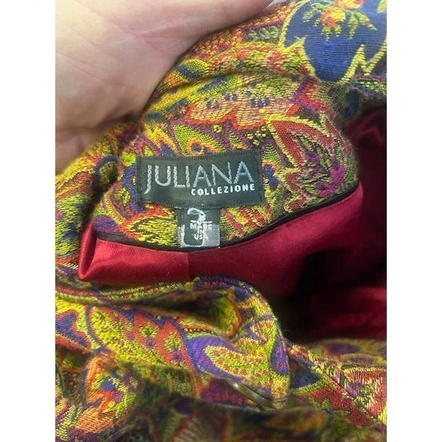 A vibrant vintage blazer exuding artistic charm. This Juliana Collezione blazer features a colorful floral tapestry design that’s sure to turn heads. The unique pattern incorporates a blend of colors, making it a versatile statement piece. With its structured silhouette and classic button closure, this blazer offers a flattering and polished look. The impeccable tailoring ensures a comfortable fit, while the eye-catching design adds a touch of personality to any outfit. Perfect for adding a pop of color to a professional ensemble, elevating a casual outfit for a weekend brunch, or making a bold statement at an art gallery opening.