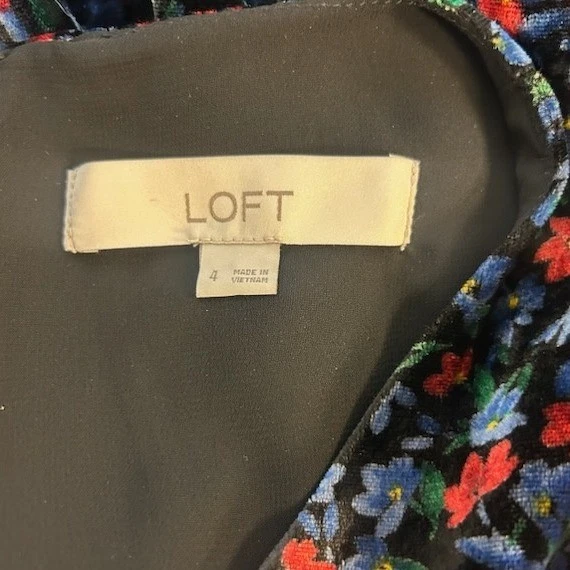 A charming Y2K LOFT velvet floral dress in navy blue with red and blue floral print. This dress features delicate flutter sleeves and a tiered ruffle hem, adding a touch of playful elegance. The luxurious velvet fabric offers a soft texture and a subtle sheen, perfect for transitioning from day to evening. A versatile piece, this dress is ideal for a holiday party, a date night, or a special dinner.