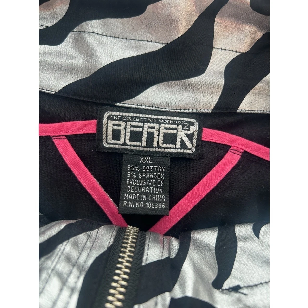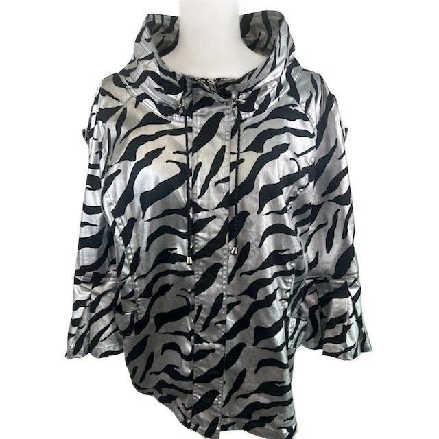 Striking statement piece in a bold design. This Berek jacket features a vibrant silver and black zebra print, a comfortable hood with adjustable drawstrings, and a full zipper closure. The jacket also includes convenient pockets and stylish details like the ruffled sleeves. Perfect for adding a touch of edgy flair to casual outings, concerts, or themed parties.