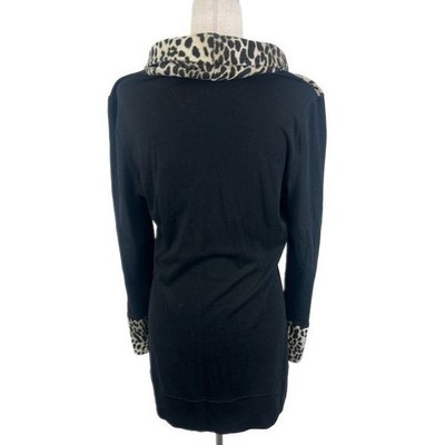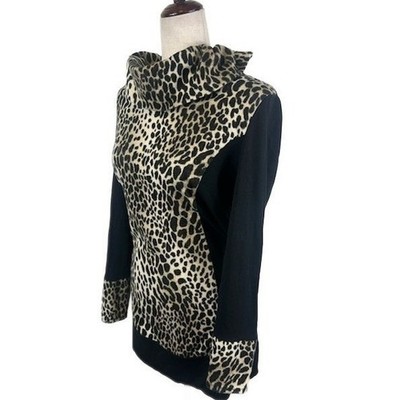 Excellent condition! Stylish tunic top with a striking leopard print, perfect for adding a touch of wild sophistication to your wardrobe. This eye-catching piece features a flattering cowl neckline that drapes elegantly. The contrast of the bold print against the solid black sleeves and back creates a visually appealing design. The long sleeves offer versatility, while the comfortable fit makes it ideal for all-day wear. The unique combination of patterns and solid colors ensures this tunic stands out in any crowd. The hemline is slightly longer in length, providing a modern and chic silhouette. Perfect for a stylish brunch, a casual Friday at the office, or a night out with friends.