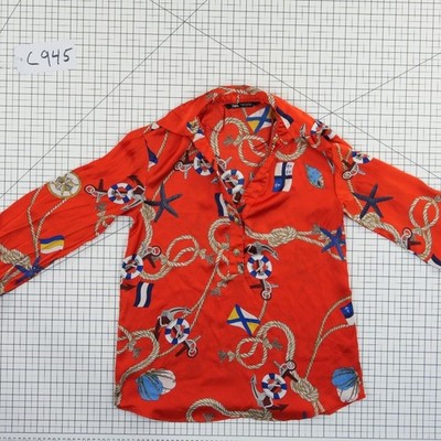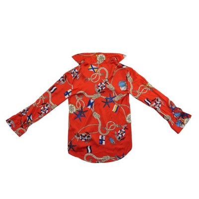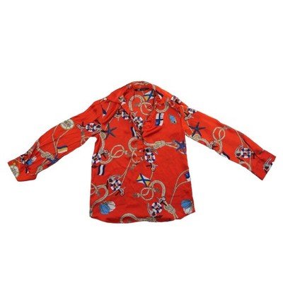 Excellent condition! Vibrant red blouse showcases a bold nautical print featuring anchors, ropes, and maritime flags throughout. This lightweight top is designed with a classic collar, a partial button-front placket, and long sleeves with buttoned cuffs for a polished yet adventurous look. The silky polyester fabric offers a smooth drape, making it an ideal choice for summer outings or vacation wear.
