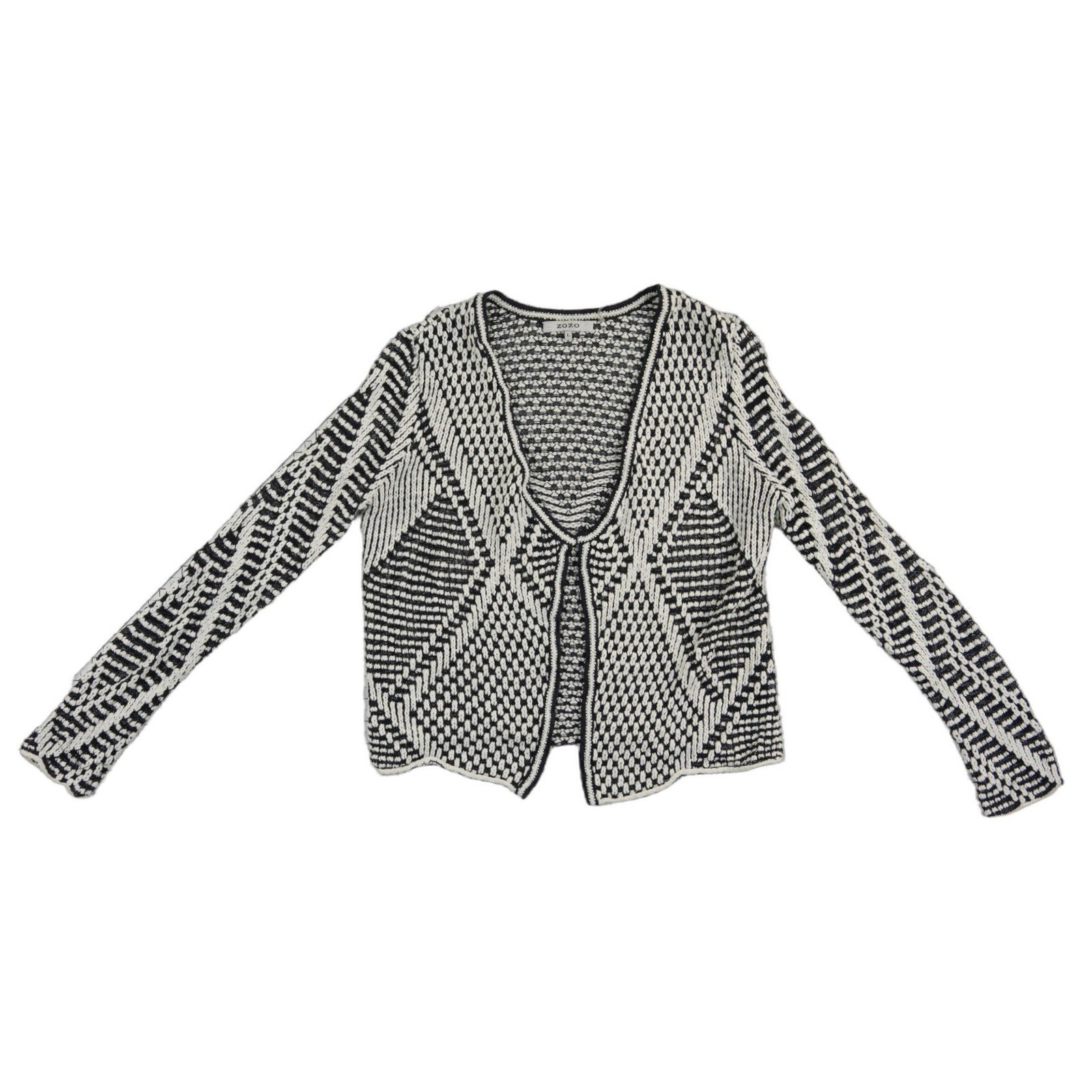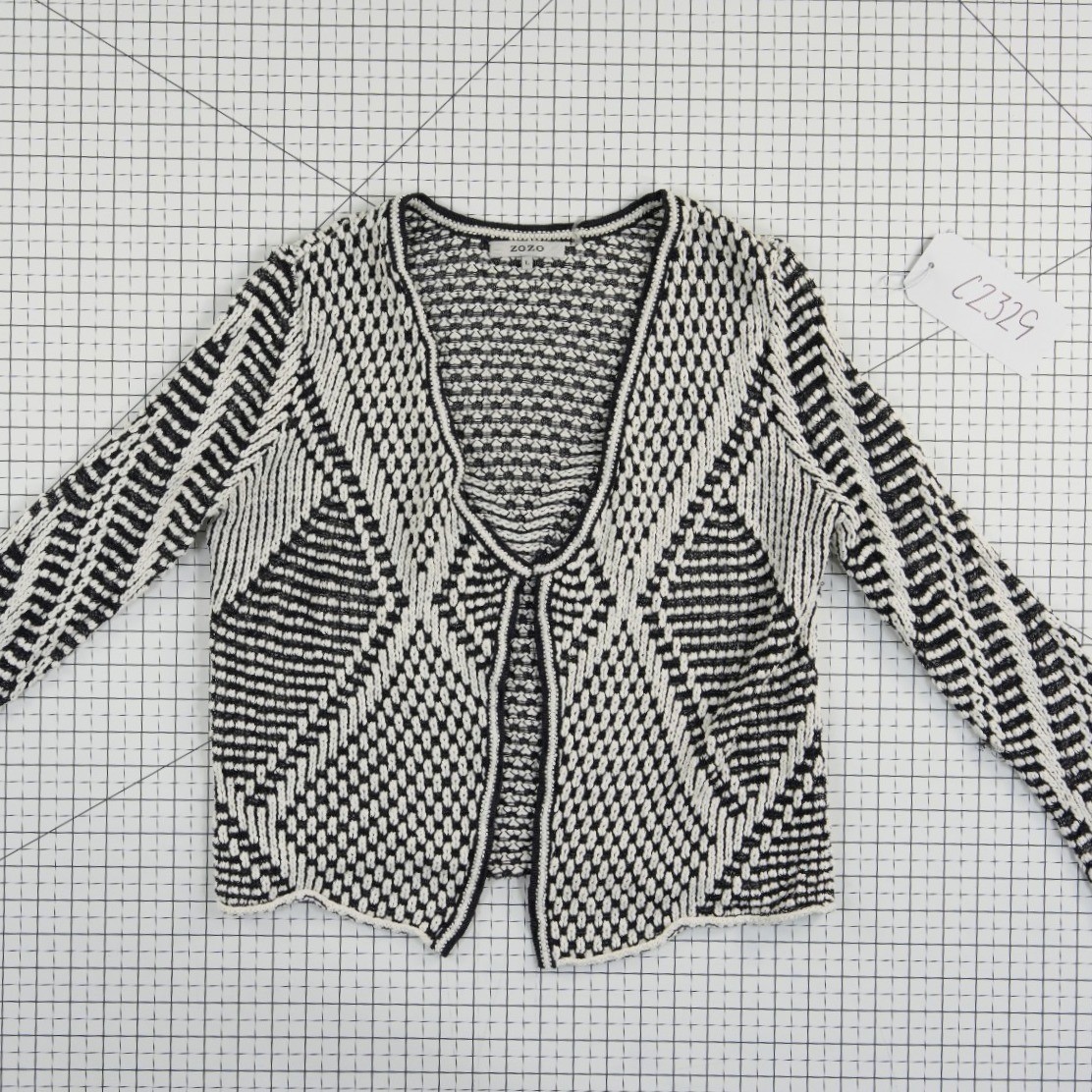 Excellent Condition! Intricate knit cardigan showcases a striking geometric diamond pattern in a classic black and white color palette. Crafted from a comfortable cotton blend, this open-front layer features a textured, chunky weave that adds depth and visual interest to any outfit. The cropped silhouette and long sleeves make it a versatile piece for transitional weather, easily paired with high-waisted denim or layered over a simple dress.