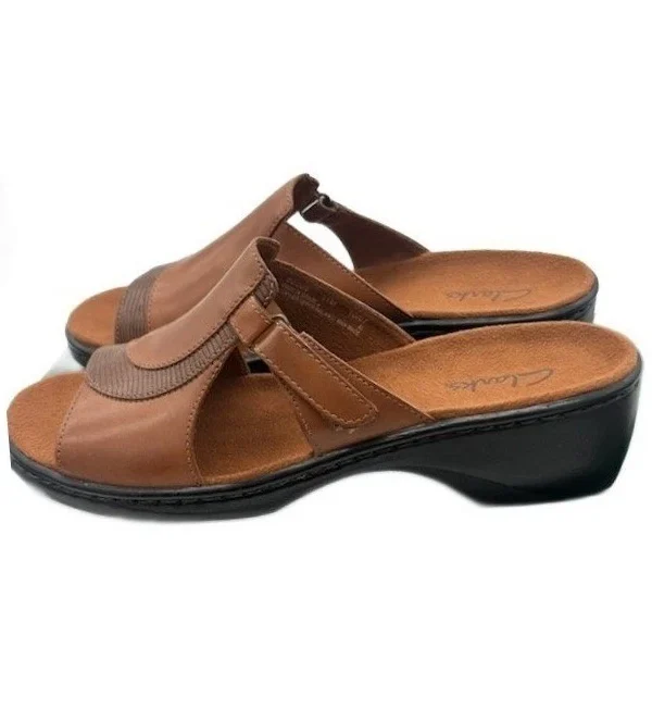 New Clarks Alyx Women's Size 11 Tan Leather Comfort Wedge Slide Sandals Shoes