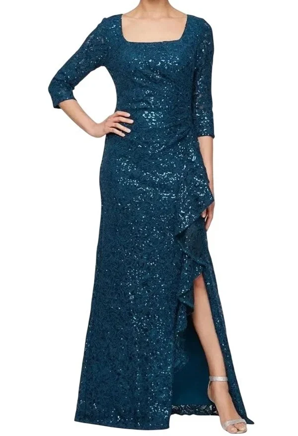 Alex Evenings Dress Women's Size 8 Teal Blue Lace Ruched Formal Long Gown Maxi