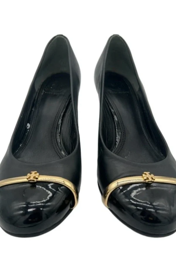 Classic Tory Burch Black Leather Gold Logo Wedge Heel Pumps Shoes Size 8.5M