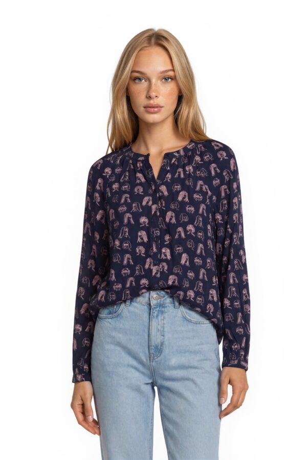 Boden Womens Size 4 Navy Blue Pink Face Print Viscose Button Front Blouse Top