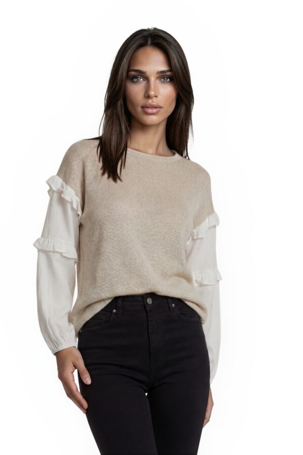 Doe & Rae Sweater Top Women's Size Medium Oatmeal Beige Ruffle Balloon Sleeve